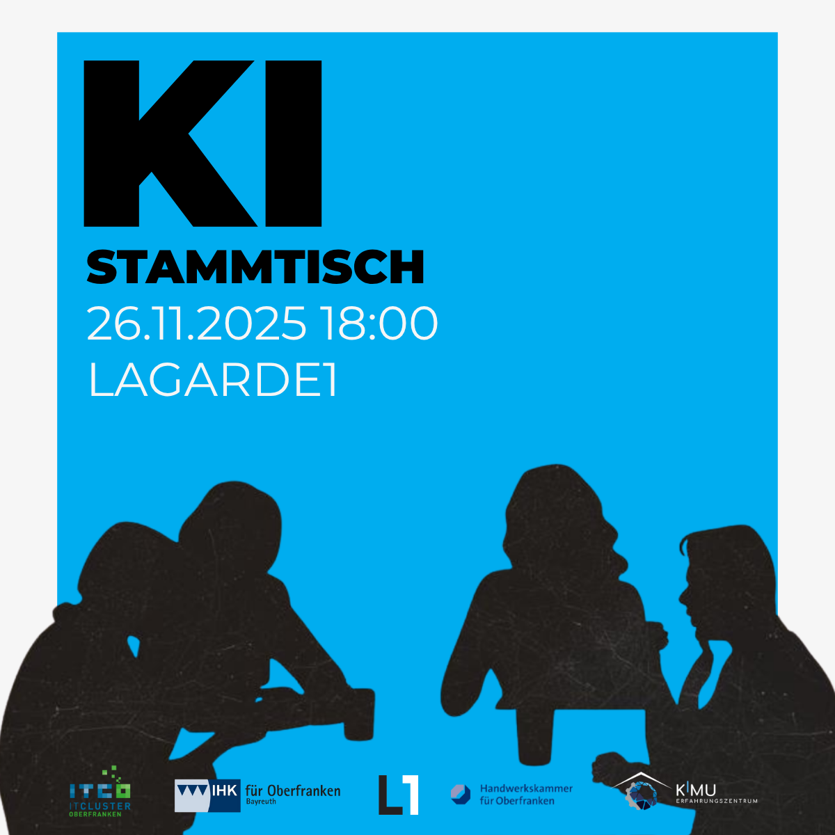 Daher haben LAGARDE1, der IT-Cluster Oberfranken, die IHK für Oberfranken Bayreuth, das KMU-KI-Erfahrungszentrum und die HWK für Oberfranken unter dem Dach der neu gegründeten KI-Allianz Oberfranken den KI-Stammtisch ins Leben gerufen.