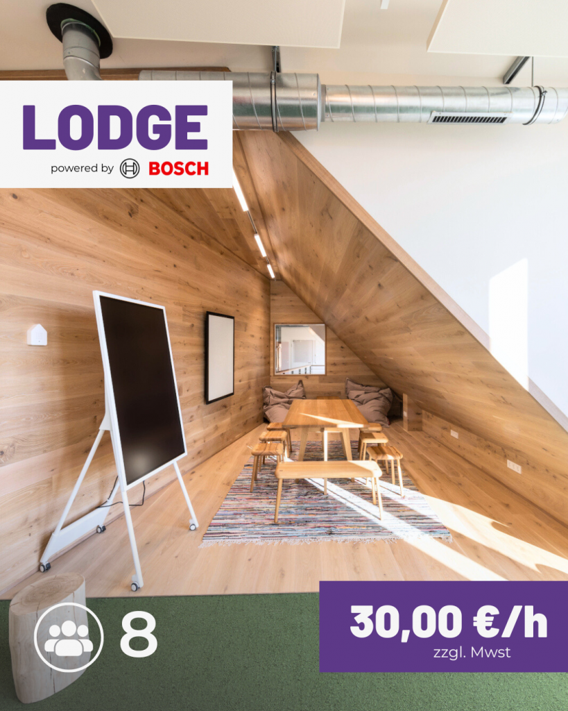 - Lodge: Ein gemütlicher Raum für bis zu 8 Personen, perfekt für kleinere Meetings oder Brainstorming-Sessions.