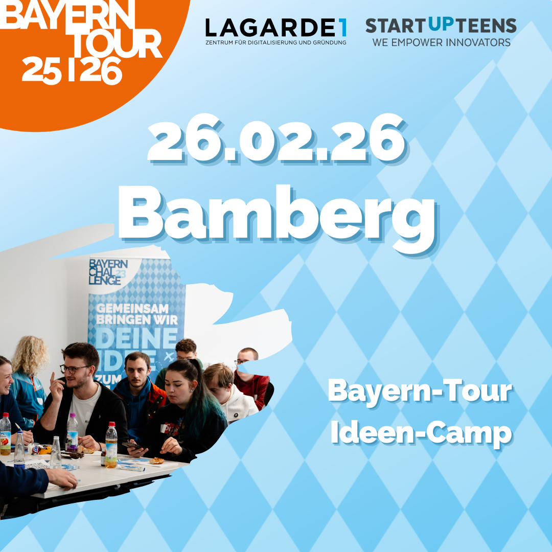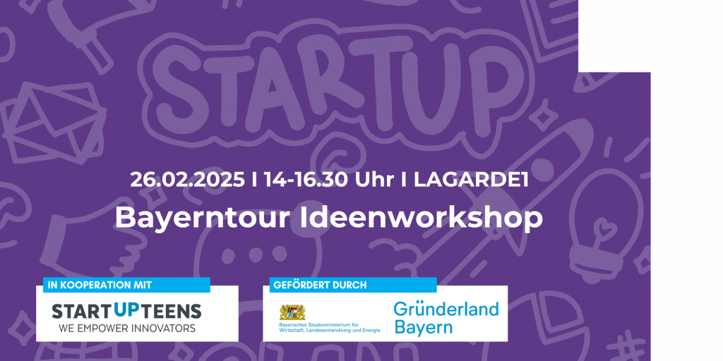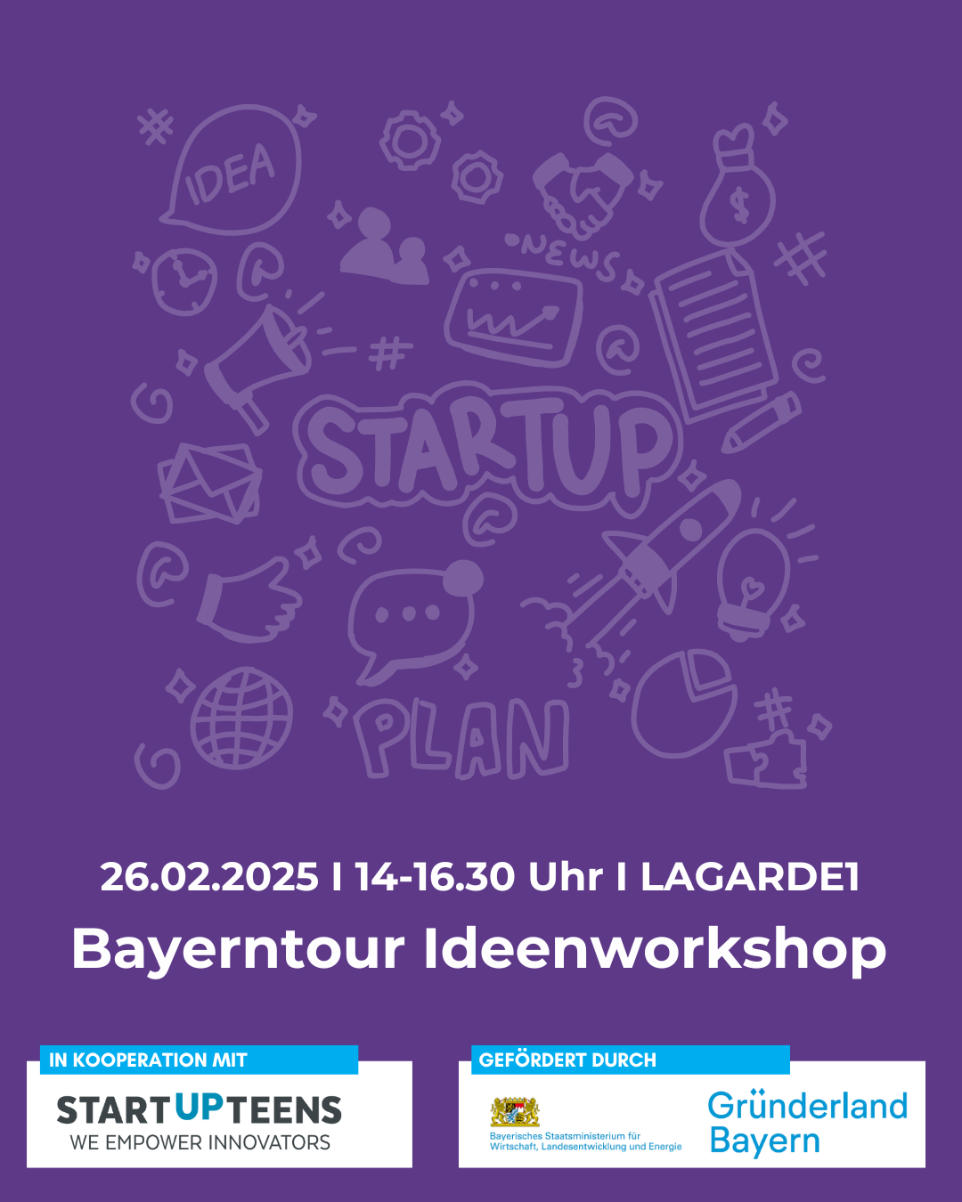 Der Startup Teens e.V. und LAGARDE1 machen Dich gemeinsam fit, aus eigenen Ideen ein Geschäftsmodell zu entwickeln. Mit Deiner Idee kannst Du dann außerdem bei der Bayern-Challenge teilnehmen und hast die Chance auf Preisgelder in Höhe von insgesamt 10.000 €.