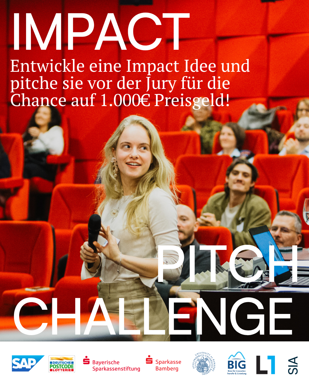 Wer in die Welt des Social Entrepreneurships eintauchen möchte, ist bei unserer Impact-Pitch-Challenge vom 16. bis 17. Januar in Bamberg genau richtig. In interaktiven Workshops werden die vielfältigen Möglichkeiten des Social Entrepreneurships vorgestellt und aufgezeigt, wie eigene Ideen entwickelt werden können. Außerdem besteht die Gelegenheit, sich mit Menschen aus der Region zu vernetzen, die ebenfalls etwas bewegen wollen. Die vielversprechendste Idee, wird mit einem Preisgeld von 1.000 € ausgezeichnet, um die nächsten Schritte zu unterstützen.