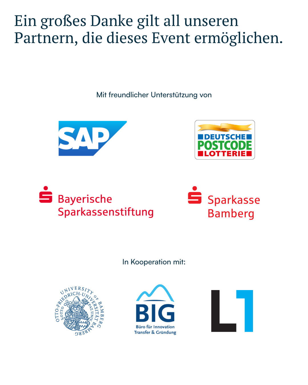Die Impact Pitch Challenge findet in Kooperation mit dem Büro für Innovation und Gründung der Universität Bamberg, dem Social Impact Award und LAGARDE1, sowie mit freundlicher Unterstützung der Bayerischen Sparkassenstiftung und der Sparkasse Bamberg statt.